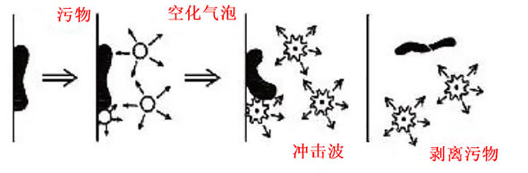 空化效果是利用空化氣泡在突然破裂時發出的沖擊波將污物從產品表面利離。剝離下來的污物受加速度牽引分離破壞,并由直進流作用分散去除。